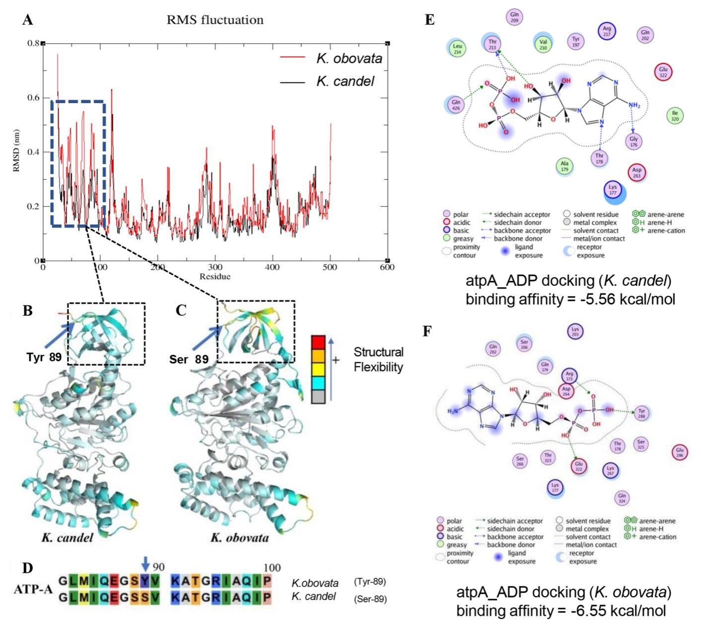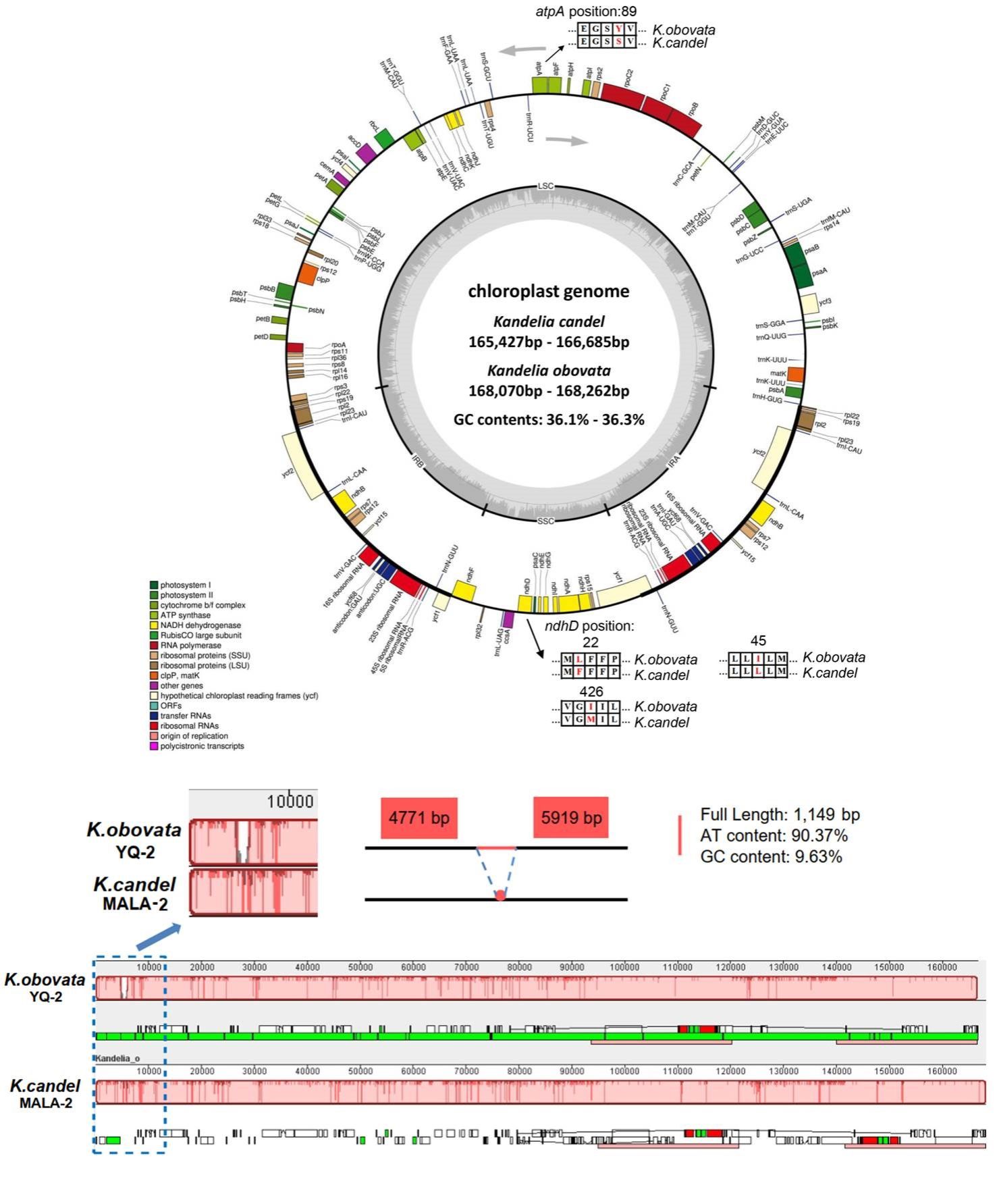 叶绿体基因组是相对保守的,一旦出现差异则预示差异基因有重要的生理生态意义。通过对马来西亚、泰国、孟加拉国和中国东南沿海分布的25个秋茄样本完整叶绿体基因组的分析,结果显示两个秋茄种的叶绿体基因组都编码128个基因,包括 83个蛋白质编码基因、37个tRNA基因和8个rRNA基因,但由于存在更多、更长的重复序列,K. obovata的叶绿体基因组比K. candle长2kb。基于插入缺失突变位点主成分分析、单拷贝基因的同源蛋白编码基因以及13种红树林物种中38个同源对基因构建的系统发育树分析,本研究明确了秋茄两个姊妹种在叶绿体基因组水平的差异。对两个姊妹种间关键的同源差异基因ndhD和atpA编码蛋白的分子动力学模拟分析显示,它们在叶绿体光合电子传递和光和磷酸化合成ATP方面显著不同,说明了在叶绿体基因组水平,光合效率和能量合成差异是两个秋茄姊妹种适应中国南海东北和西南不同地理环境的关键所在。