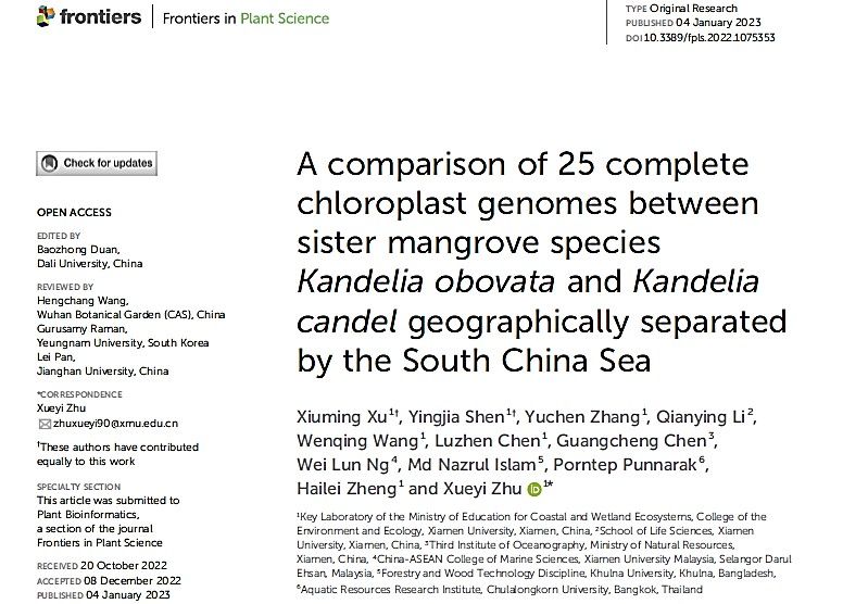 近日,永利集团304am登录朱学艺副教授与学院多位老师合作在国际期刊Frontiers in Plant Science上发表了题为“A comparison of 25 complete chloroplast genomes between sister mangrove species Kandelia obovata and Kandelia candel geographically separated by the South China Sea” 的研究论文,揭示了以中国南海东北和西南分布的秋茄两个姊妹种在叶绿体基因组水平的差异及关键差异基因编码蛋白对其生境响应的分子特点。